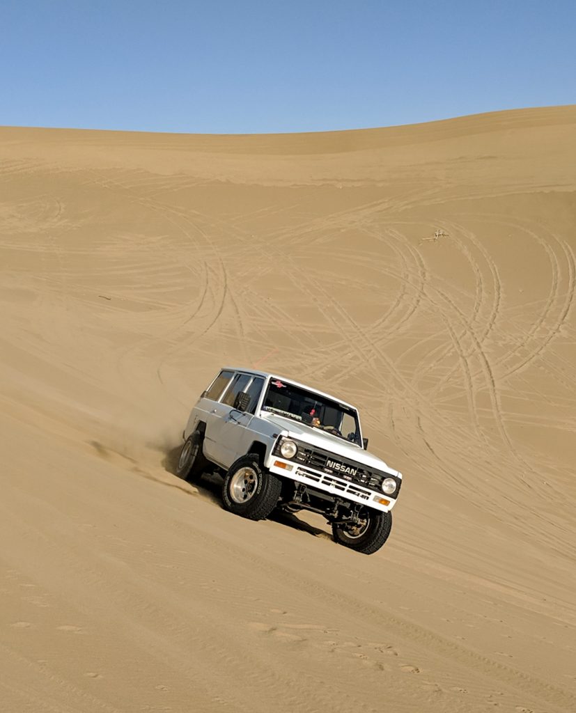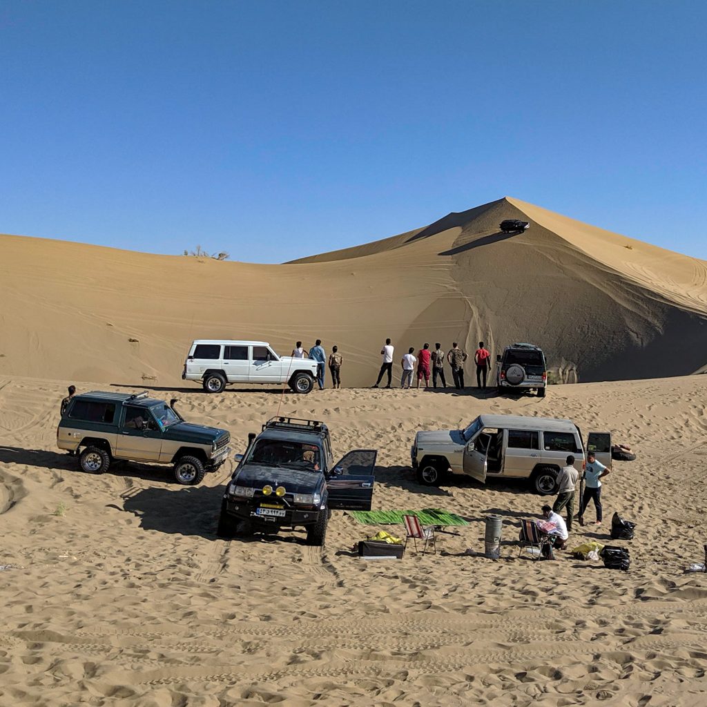 Spet so pripeljali isti terenci in bilo jih je vedno več in več. Zbralo se je kakšnih 15 avtov in morda 30 Irancev, vsi so bili člani off-road kluba iz Esfahana. Ponovno so naju povabili v puščavo, nekateri so govorili angleško in še zdaj ne vem od kod sva našla pogum, da se dejansko pridruživa tem neznancem, norcem, ki delajo salte po sipinah. Pomagali so nama spustiti tlak v pnevmatikah, nato pa nama določili vodjo, najbolj izkušenega izmed voznikov.